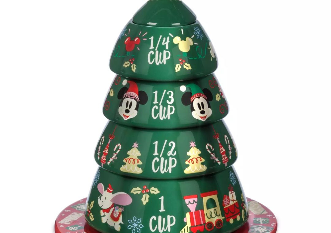 Measuring ingredients for your Christmas cookie recipe or holiday feast doesn’t have to be boring with this measuring cup set that stacks into an adorable tree, decorated with iconic characters and Disney Parks icons.